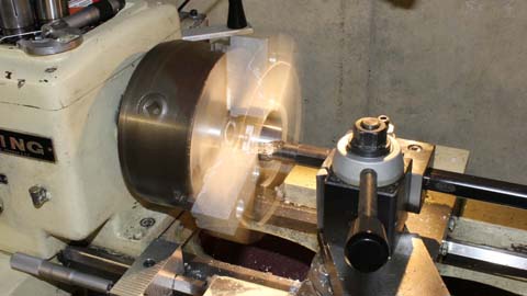 resetting the part in the jaws, I began turning the other end features. The through hole in the housing had been bored just over 3" deep in the first setup. Once I broke through to this