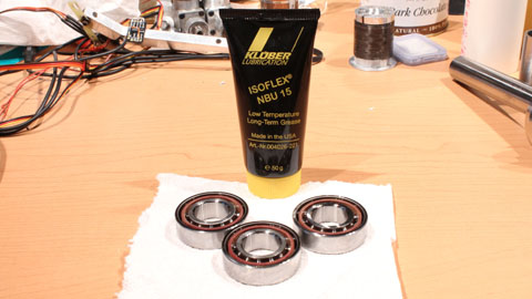 Kluber Isoflex NBU 15 and the three Barden 104HDL bearings. The bearings are rated to 36,000 RPM with grease.