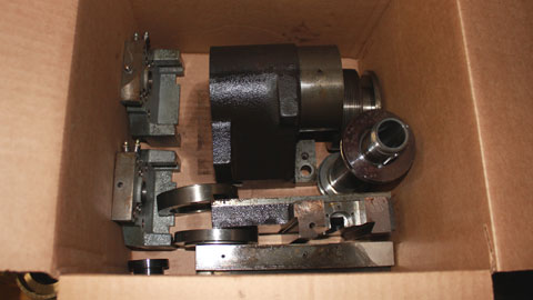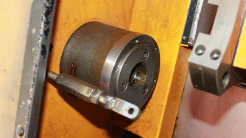 | The bare spindle, with an adapter plate of some kind. The rod in the foreground was connected to an air cylinder. I was told the previous owner used it to actute a collet chuck. | |