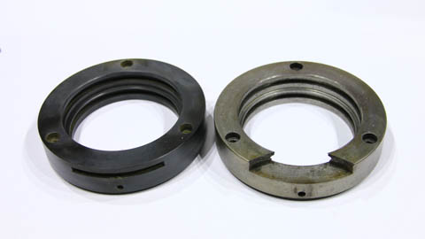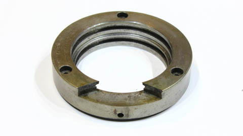 May 14, 2013 If the spindle must be disassembled, study the spindle drawing in the parts diagram. The pulley is secured with a nut which nests in the back of the pulley flange. There is a set screw in one of the two holes which must be loosened. The nut is then removed with a pin spanner. Now, the pulley is removed with a puller. Loosen the set screw in the bearing preload nut before removing the nut. At this point the spindle is pressed out leaving the bearings in the housing. The nose cap is removed and the inner race of the nose bearing can be accessed and the outer races pulled. The bearing races are a light press fit. There is a labyrinth seal with close tolerances in the front cap so do keep the spindle square when pressing it out. Keeping the spindle square shouldn't be a problem with both bearings in the housing. Bearings are listed as 32009XA P6, but I'm unsure if P6 is standard quality in this type. I suspect not. Update: P6 is standard precision. There was a lot of orange looking slime in the housing. None of this was in the bearings. There is a ring behind each bearing which acts as a dam to allow dirt to settle without reaching the bearing. There are signs of pitting in the dams and retaining rings, but the bearings were clean. The nose bearing has seen better days and will be replaced. |