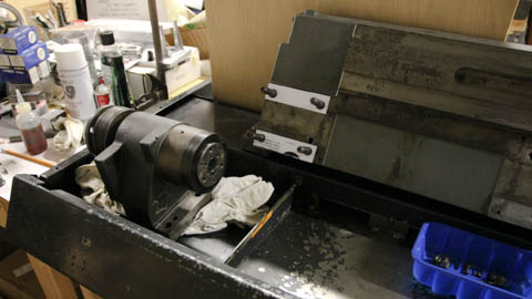 April 18, 2014 The spindle is reassembled. Bearing preload not set and will be done when the motor is installed. There were paper shims under the spindle when I took it apart. I didn't pay particular attention to thickness. Glossy card stock was used to make new shims. Shimming the headstock, turret, and tailstock allows for bringing these components to the same center height. |