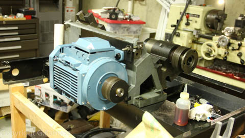 April 24, 2014 The motor I chose is an ABB M2AA100LA-4 rated 1720 RPM and 2.5kW at 250VAC, 60Hz with delta connection. This motor will provide virtually identical power and torque to the original DC motor. The shaft is an identical match and the footplate very similar. I added threaded holes in the Emco mounting brackets to match the rear bolt holes in the motor's foot plate. |