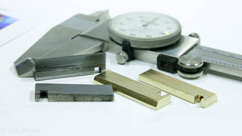February 3, 2015 The old X axis gibs didn't look very good, so I made new gibs from aluminum bronze. I used the old gibs to set the taper angle. The thickness is important as a small difference will make the gib useless. |